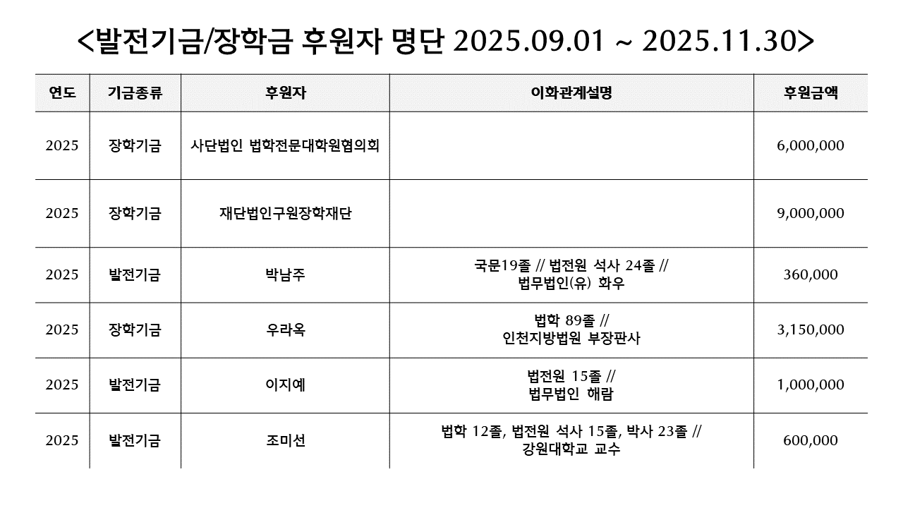 후원해 주신 발전기금은 로스쿨과 일반대학원 법학과 운영비, 연구진흥비, 변호사시험 대비 지원비 등으로 사용될 예정이며, 여러분의 발전기금으로 전국 최고의 여성 법조인 산실로서 명성을 지키기 위해 최선의 노력을 다하겠습니다. 보내주신 성원에 감사드립니다. |