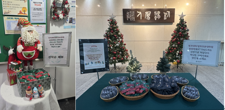 2025년 12월 19일, 본교 법과대학·법학전문대학원 동창회에서 올해도 성탄절을 맞이하여 재학생들을 위해 떡을 보내주셨습니다. 법학관 1층 로비와 솟을관에서 나눔이 진행되었고, 추운 겨울에도 학생들이 따뜻한 떡과 함께 따뜻한 마음을 나누는 시간이었습니다. |