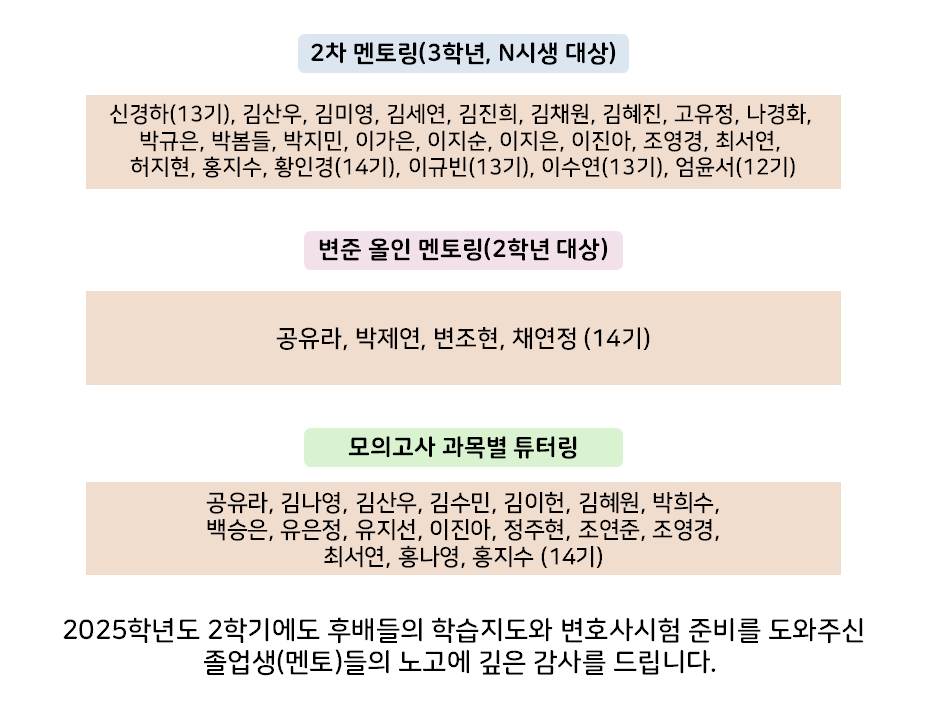 2025년 9월 25일, 우리 법학전문대학원 출신 민수정(9기), 우승민(8기), 유주원(8기), 유지영(8기), 이예지(9기), 이채영(8기), 임여은(7기), 조선(9기), 조예림(7기) 총 9명이 신임법관으로 임명되었습니다. 2025년 9월 26일부터 2026년 2월 20일까지 사법연수원에서 신임법관 연수를 받은 후, 2026년 2월 23일 각급 법원에 배치될 예정입니다. |